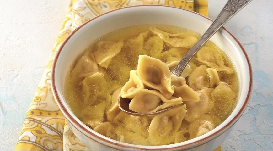 - С помощью половника разливаем пельменный суп в глубокие пиалы (супники). На каждую порцию идет около 30–40 конвертиков с фаршем.