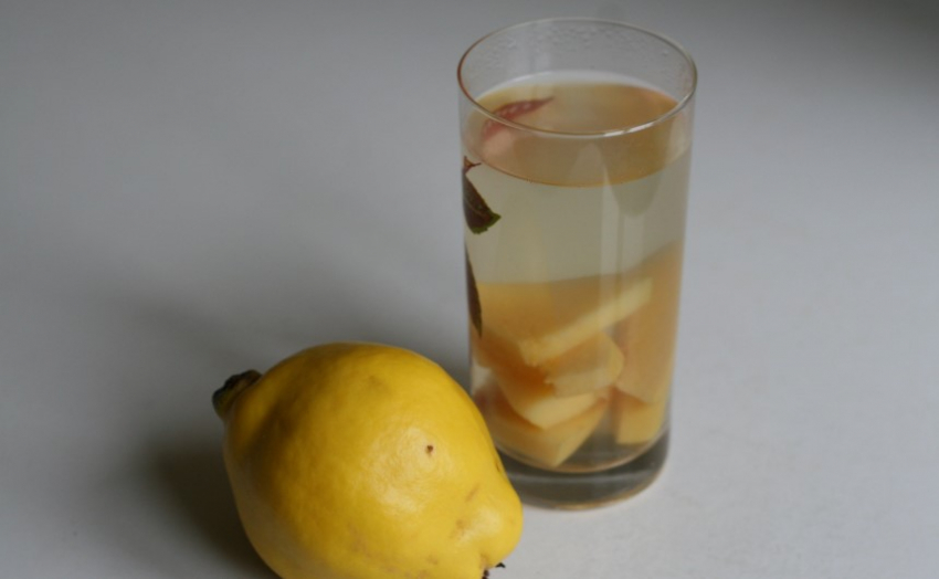 2. В кастрюлю налить 2 литра воды, добавить айву и поставить на огонь. Как только вода закипит, нужно убавить огонь и варить ещё в течение 10-15 минут. Добавить немного молотой корицы для вкуса, остудить компот и разливать по стаканам.