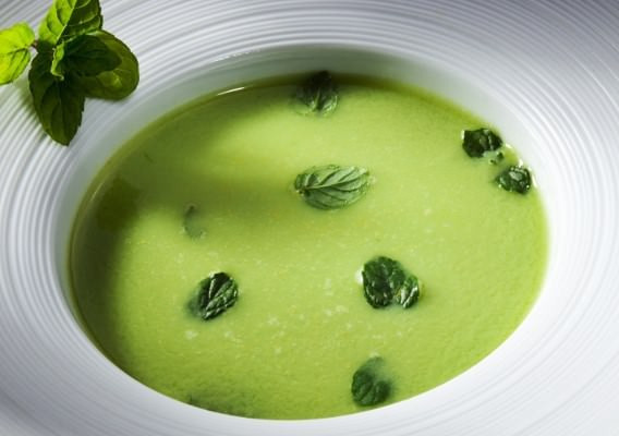 Мелко нарежьте чеснок и сельдерей. Разогрейте оливковое масло в кастрюле с толстым дном, обжаривайте чеснок и сельдерей в течение трёх минут. Разберите брокколи на соцветия и добавьте в кастрюлю. Слегка потушите и влейте бульон. Варите 5-10 минут, пока капуста не станет мягкой. Снимите суп с огня. Добавьте 2 ст. ложки листьев мяты и пюрируйте с помощью блендера. Поперчите, посолите по вкусу. Подавайте суп из брокколи, украсив свежей мятой, сыром и небольшим количеством оливкового масла.