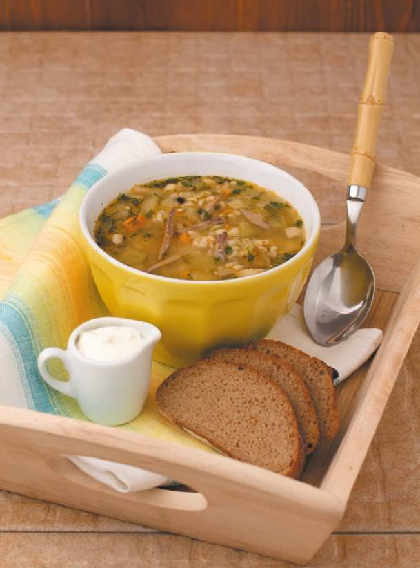 Разливая суп по тарелкам, позаботьтесь, чтобы в каждую тарелку попали мясо и куриные субпродукты. Положите по ложке сметаны. Неплохой идеей будет посыпать суп свежей зеленью. Если будете добавлять ее в кастрюлю, а не отдельно в каждую порцию, суп после этого необходимо еще раз прокипятить, чтобы защитить от преждевременного закисания.