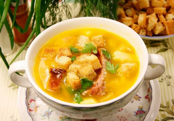 Наложить в сковородку оставшееся масло. После того как оно начнет пениться, наложить кубики хлеба. Поджаривать до золотистого цвета. Перемешать с беконом. Суп распределить по тарелкам, в каждую наложить крутоны с беконом. Славного аппетита!