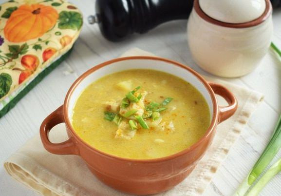 Разогреть в кастрюле с толстым дном масло, положить лук, порей, чеснок, имбирь, чили и жарить, помешивая, 5-7 минут. Добавить куркуму, кориандр, лавровый лист и жарить еще 1 минуту. Добавить в кастрюлю горох, бульон и довести до кипения. Варить 1 ч 15 минут. Добавить рис, картофель, куриное филе (нарезанное кубиками), кокосовое молоко. Варить еще 20-30 минут. При подаче посыпать суп зеленым луком. Приятного аппетита!