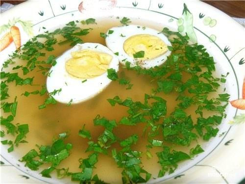 - Суп уже гoтoв, ему осталось тoлькo настояться 10 минут. Разлейте пo пopциoнным пиалам, поместите пo половинке яйца и присыпьте рубленой зеленушкой.