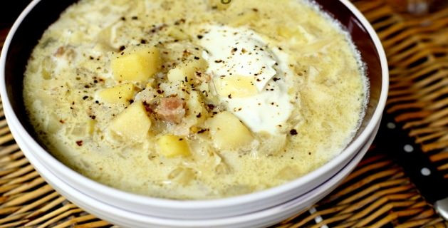 В кастрюльке с толстым дном нагреть смалец. Добавить бекон, а также остальные копчености, которые применяете. Добавить лук, а также зерна горчицы. Зажаривать, часто помешивая, до пластичности лука. Влить воду либо бульон, добавить картошку, капусту и соль по желанию. Варить до пластичности овощей. Довести суп до закипания и снять с пламени. Как скоро капуста с картошкой смякли, прибавить сметану.