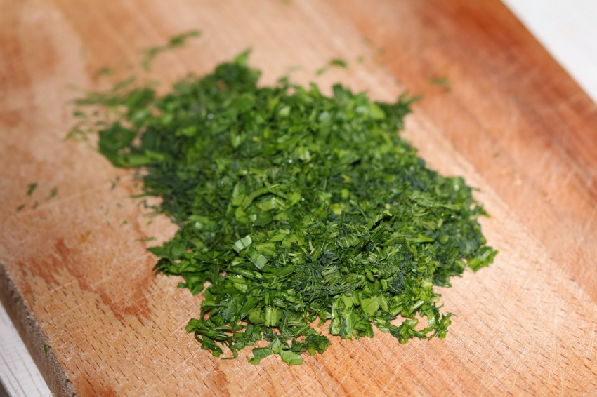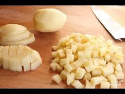 4. Картофель нарезать небольшими кубиками. Лук – полукольцами. Петрушку измельчить. Всё это добавить в бульон вместе со специями.