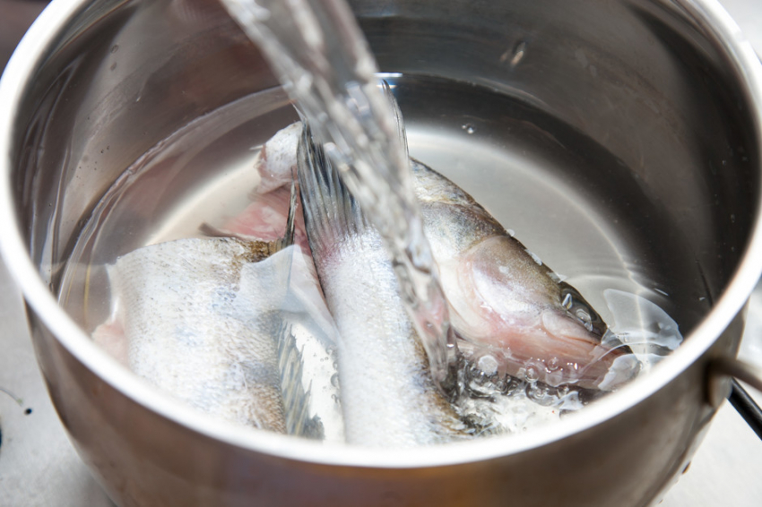 1. Маленькую неочищенную рыбу и головы большой (без жабр) положить в котел и варить не меньше 15 минут.