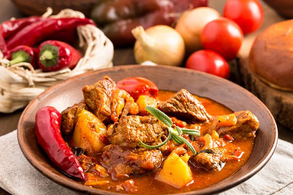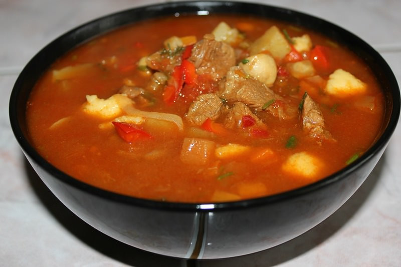 Суп-гуляш по-венгерски – это непосредственно и первое, и второе яство. Это не только жаркое из мяса с овощами, а также подливкой, но вместе с тем и наваристый, плотный и острый супчик с крупными кусочками мяса и картошки. Часто подается с лапшой тархоня либо с клёцками чипетке.