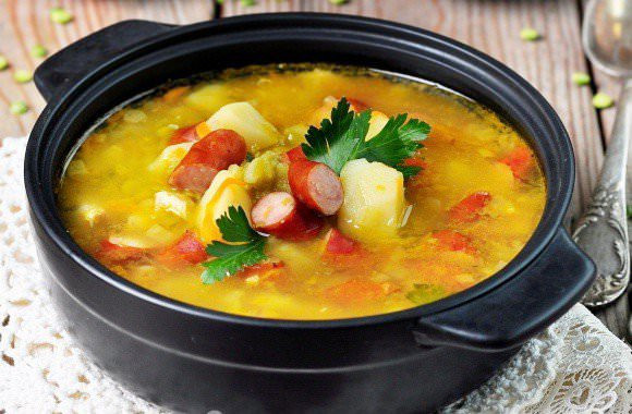 В мультиварке можно приготовить различные варианты горохового супа: пюре или с целыми горошинами. Предлагаем вам рецепт густого супчика из гороха с колбасой-ассорти по своему вкусу, в котором часть гороха разварена в пюре, а часть остается целой.