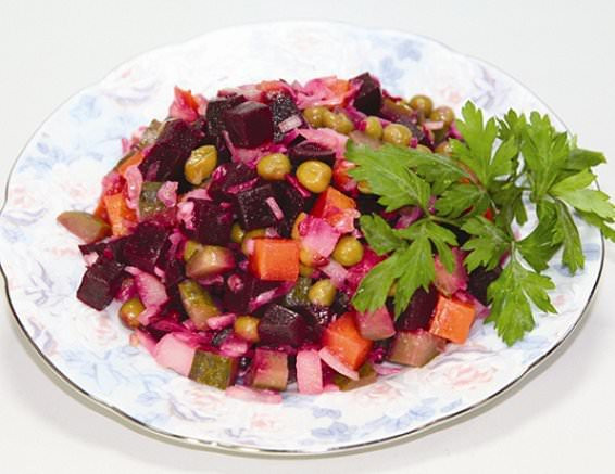 Подготовленные овощи, квашеную капусту и рыбу смешайте, добавьте мелко нарезанные маринованные грибы. Заправьте винегрет растительным маслом и горкой выложите в салатник.