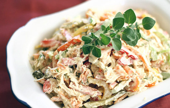 Зелень вымыть, обсушить, мелко нарубить. Майонез смешать с лимонным соком, заправить смесью салат. Готовое блюдо украсить нарубленной зеленью.