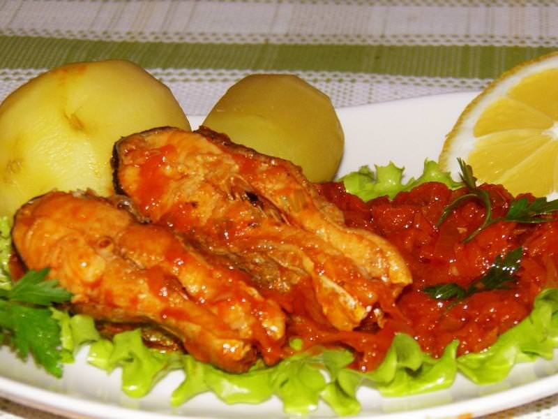 - Добавить к овощам томат, перец горошком, лавровый лист, сахар и уксус по вкусу, прокипятить 1-2 минуты. Горячим маринадом покрыть рыбу, закрыть крышкой и выдержать как минимум несколько часов, но лучше оставить на ночь в холодильнике.