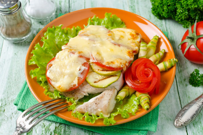 - Подержите на огне несколько минут. Уложите в противень вначале овощи, следующий слой – посоленное и наперченное филе.