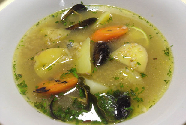 В самом конце добавить подготовленные вымытые мидии и дать им провариться с похлёбкой ещё минут 7, пока все раковины не раскроются.