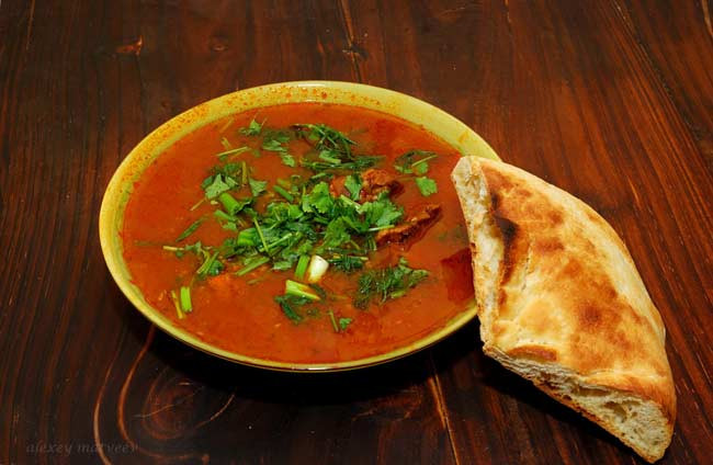В переводе из грузинского название этого кушанья означает «говяжий суп», но это совершенно не значит, что его приготовление из других видов мяса невозможно. Не зря при упоминании этого блюда стоит уточнять местность его происхождения. Но стоит заметить, что изменение рецептуры его выполнения никаким образом не портит вкусовые качества этого супа, более того это только добавляет пикантности и вносит новые краски, восполняя вкусовые впечатления.Однако стоит запомнить, что основной вкусовой особенностью острого первого блюда является кислая основа и характерный пряный аромат Востока.