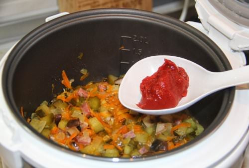 - Через 5 мин добавить томатную пасту и 1 м. ст. воды, лимонный сок, сахар, соль и доготовить.