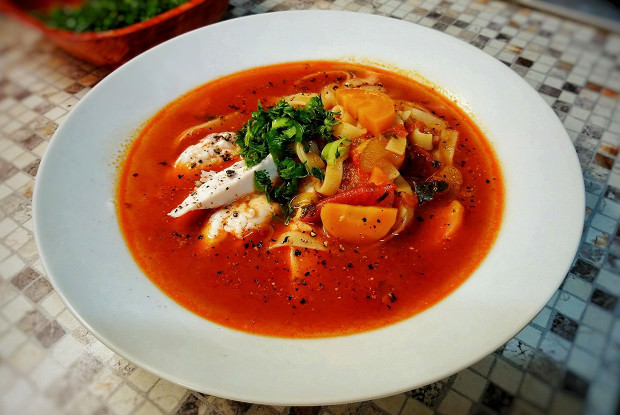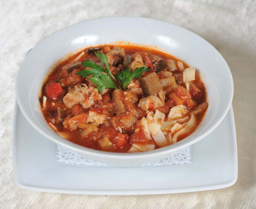 - За 10 минут до окончания тушения добавьте в сковороду порезанные дольками перцы и паприку. Разогреть бульон, добавить в кастрюлю содержимое сковороды, перемешать, если надо разбавить — влить кипятка, варить 15 минут. Посолить и поперчить по вкусу.