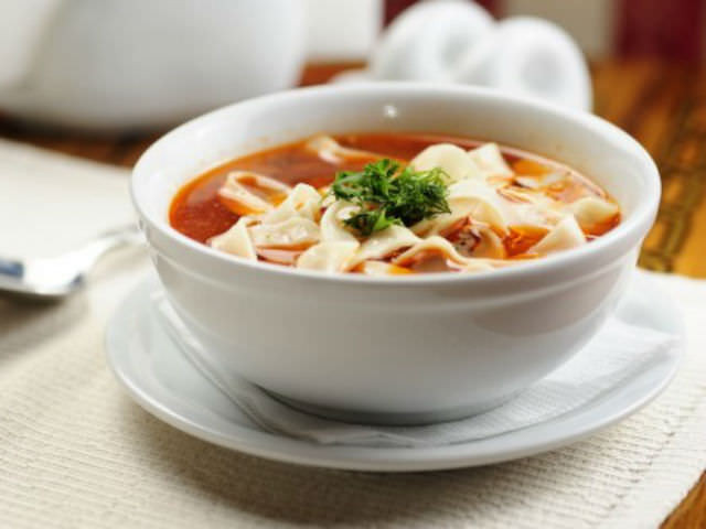 - Пока варятся овощи, отдельно отварите лапшу. Подавать в глубокой тарелке или косушке. Сначала положите лапшу, а затем залейте жидкостью с овощами.