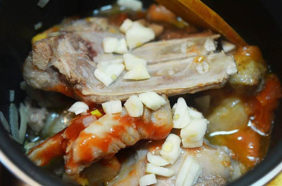 - Туда же положите томатную пасту и залейте бульоном. Доведите до кипения и оставьте на среднем огне до тех пор, пока не сварится картошка (около 35 минут).