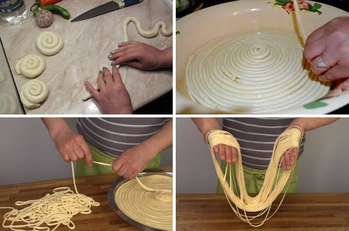 Растянутую лапшу откладывайте в сторону, но так, чтобы она не лежала у вас кучей: весь получившийся серпантин лучше так серпантином и уложить. И так поступаем с каждой “сосиской”. Эта процедура (по времени) сродни домашней лепке пельменей впрок: чтобы “растянуть” 750 граммов теста, у меня, например, ушло больше двух часов.