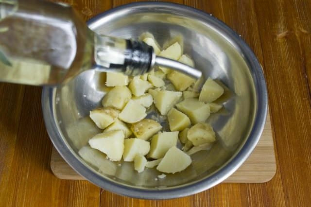 Сваренный в мундире картофель чистим от кожуры, нарезаем крупными кубиками. Добавляем 10 г оливкового масла первого холодного отжима сорта extra virgin. Масло покроет картошку тонкой плёнкой, и она не размякнет от контакта с влажными ингредиентами.