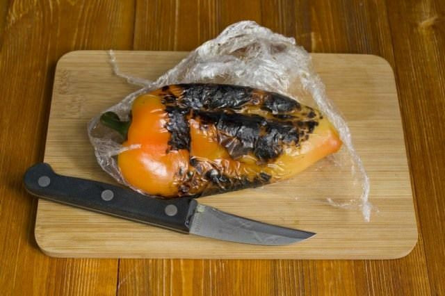 Сладкий болгарский перец накалываем вилкой в нескольких местах. Включаем небольшую газовую горелку и обжигаем перчик со всех сторон, периодически поворачивая за хвостик. Когда кожица обуглится, сразу заворачиваем перец в пищевую плёнку, оставляем на 5 минут.