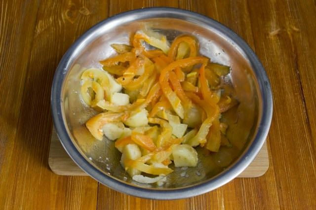 Запеченный перец чистим от кожицы, отрезаем плодоножку, убираем семена. Мякоть режем тонкими ломтиками, добавляем в салатник к картофелю.