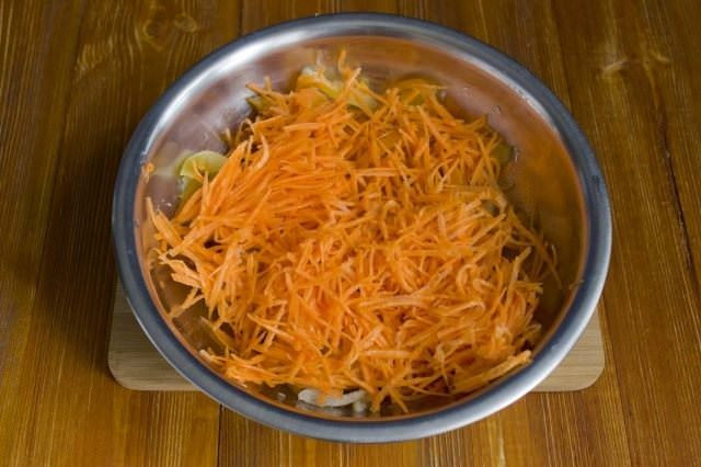 Свежую морковь трём мелко. Советую использовать именно мелкую тёрку, так как крупные кусочки морковки будут жёсткими. Добавляем морковку к перцу и картошке.