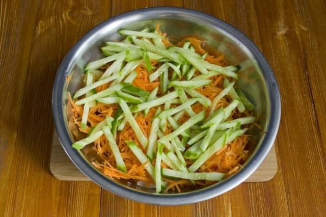 Свежий огурец режем тонкой соломкой. Зрелые или длинно-плодные огурцы чистим от кожуры, убираем семена, молодые огурчики чистить не нужно.