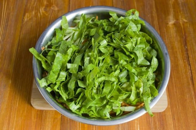 Шпинат замачиваем в миске с холодной водой на несколько минут, чтобы легче смыть песок и грязь. Затем промываем под краном, отряхиваем, режем полосками шириной 1 сантиметр.