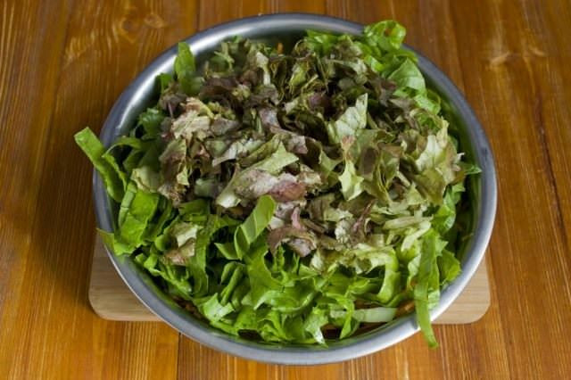 Также обрабатываем листовой салат. Вы можете использовать любой сорт, я взяла оаклиф, или дубовый листок – рыхлый кочан с коралловыми и зелёными листочками, который имеет лёгкий ореховый привкус.