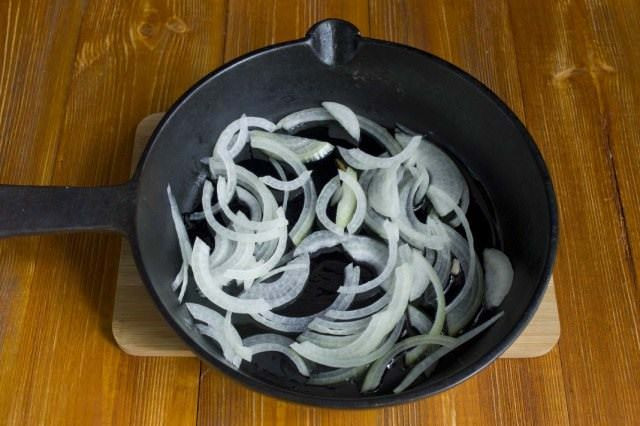 В чугунной сковороде пассеруем 5 минут нарезанный тонкими кольцами репчатый лук.