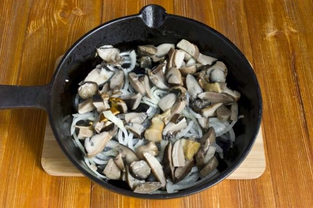 Сваренные до полной готовности лесные грибы откидываем на сито, затем режем мелко, добавляем в сковороду, обжариваем 5-6 минут, пока влага полностью не выпарится.