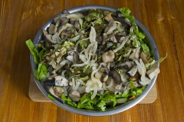 Добавляем обжаренные грибы в салатник, посыпаем всё морской солью по вкусу, приправляем молотой паприкой, добавляем оставшееся масло, перемешиваем.
