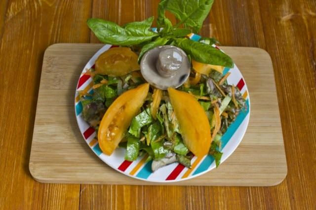 Выкладываем салат горкой на тарелку. Спелые сладкие помидоры режем большими ломтиками. Украшаем блюдо кусочками томатов, целыми грибочками и посыпаем свежей зеленью. Сразу подаём на стол. Приятного аппетита!