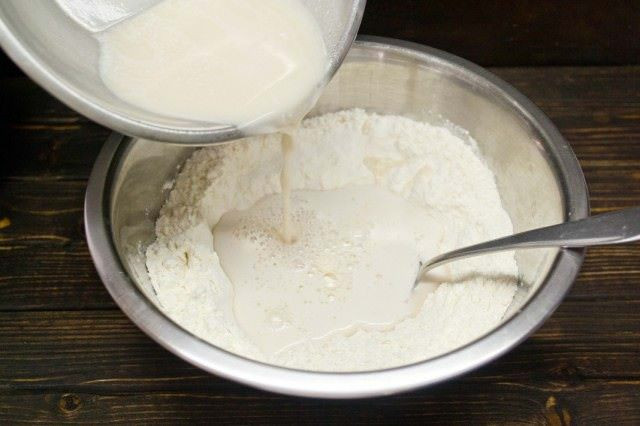 Добавляем качественное оливковое масло, замешиваем тесто сначала ложкой.