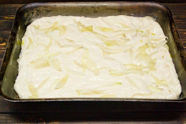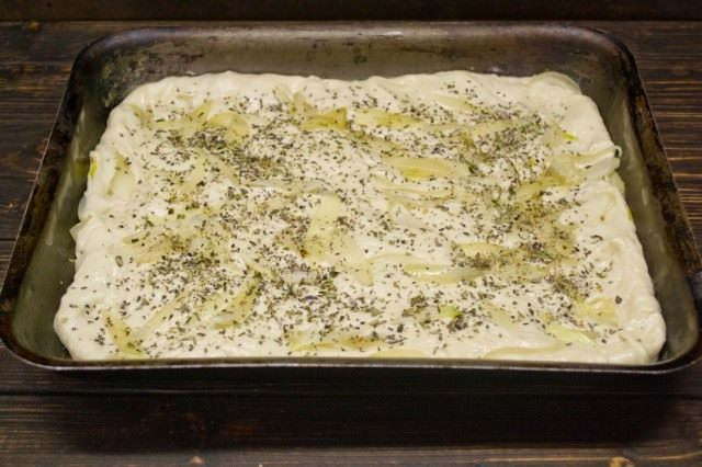 Бережно, стараясь не уничтожить полностью пузырьки воздуха в тесте, растягиваем его руками до размера формы, добавляем обжаренный и остывший репчатый лук, аккуратно вмешиваем лук в тесто.