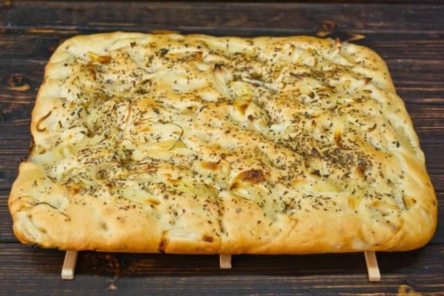 Тесто для постного хлеба с луком очень похоже по составу на тесто для пиццы, по сей день, многие авторы спорят о том, что было раньше пицца или фокачча. На самом деле не только рецепт теста, но и процесс приготовления очень похожи, фокачча, так же как и пицца – тонкая лепешка, приготовленная быстро в очень горячей духовке.