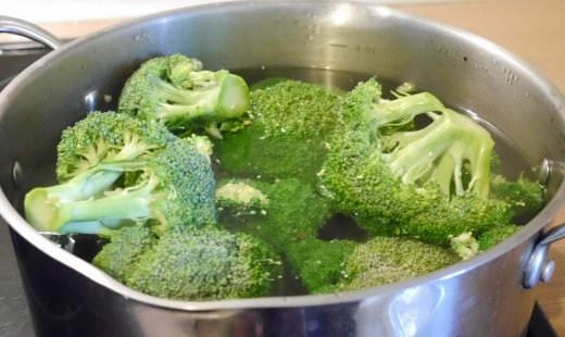 Берем большую кастрюлю, наливаем в нее воду, подсаливаем, и после закипания бросаем туда соцветия брокколи.