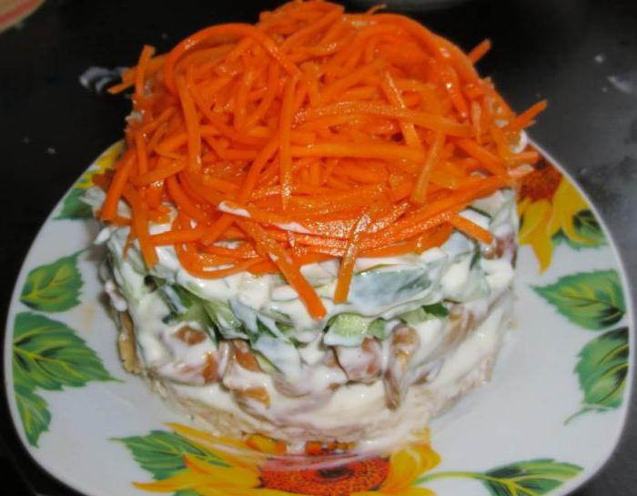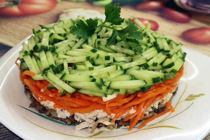 - 3-й слой огурец, майонезная сеточка, 4-й слой корейская морковь. Салат следует поставить в холодное место для пропитки.