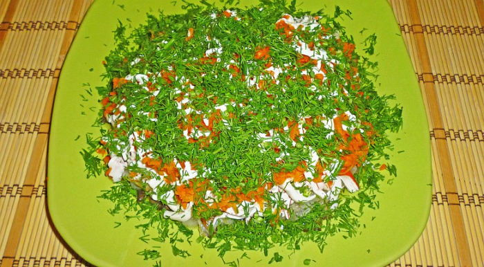 - Приготовьте плоское блюдо для салата. Укладывайте салат слоями в следующей последовательности: 1-й слой: половину тертого картофеля, смазываем майонезом. 2-й слой: выкладываем мелко порезанную зелень.