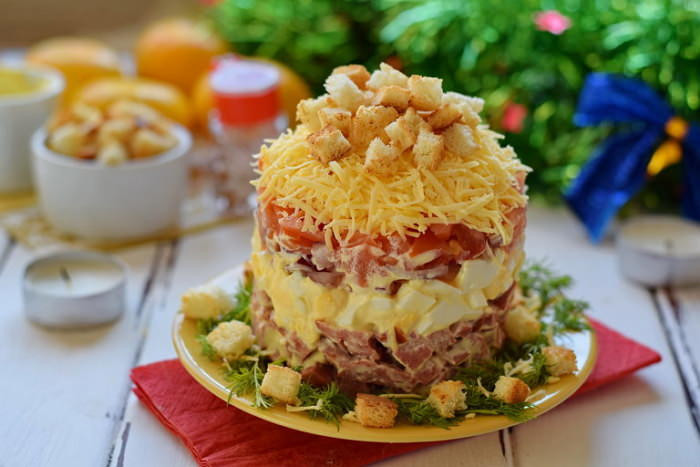 Салат с сухариками и колбасой, пошаговые рецепты