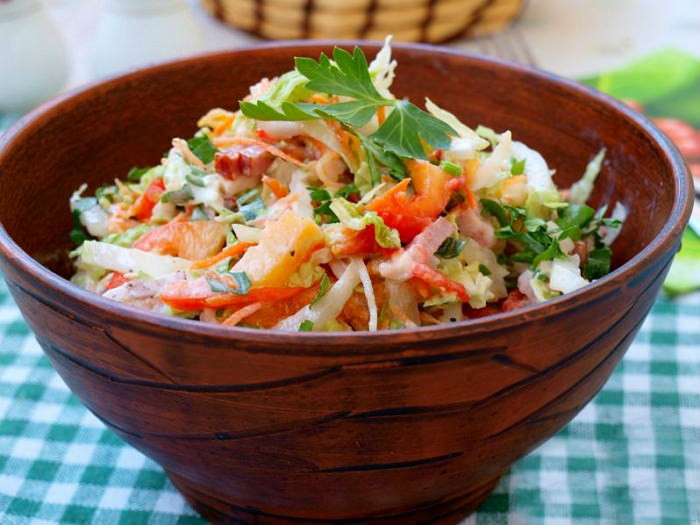 - Нижний слой состоит из пекинской капусты. Ее следует помыть, порезать мелкой соломкой. Выложить на отдельное блюдо.
