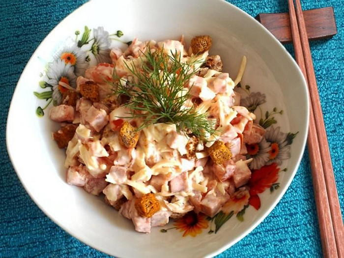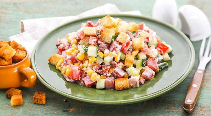 Редакция «Быстрые Рецепты» подготовила специально для вас лучшие рецепты приготовления салатов с копченой колбасой. Чтобы разнообразить и без того богатый ассортимент салатиков с колбасой, поэкспериментируйте с сортами этого мясного деликатеса чтобы приготовить закуски на любой вкус. А чтобы салатик с колбасой был еще и полезным, старайтесь добавлять больше овощей. Как правило овощи нейтрализуют жиры, а значит закуска не сильно навредит вашей фигуре.Салат с сухариками и копченой колбасой