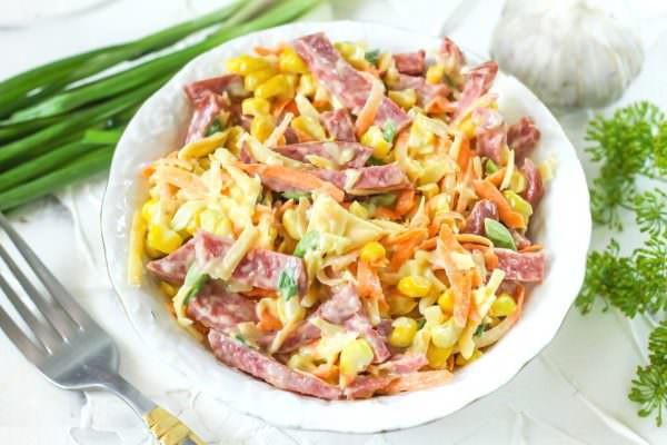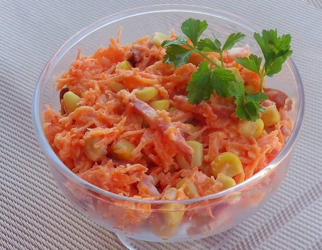 - Сложить в миску морковь, копченую колбасу, кукурузу без жидкости, выдавить чеснок, заправить салат майонезом.