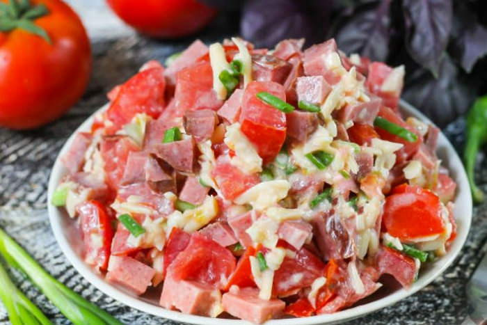 Такой популярности салат обязан своей простоте и насыщенному вкусу. Чтобы приготовить такой салатик понадобится не много времени. Также следует заметить, что салаты с колбасой подойдут и на праздничный стол, достаточно просто украсить их любыми доступными способами.