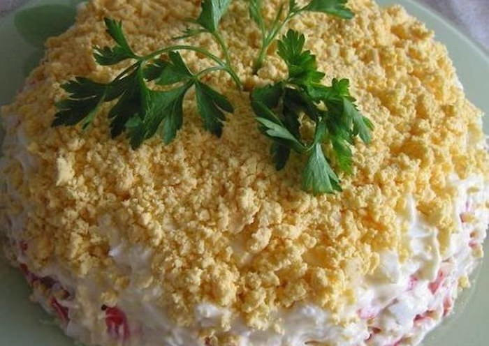 - Куриные яйца отварить до готовности. После остывания очистить и натереть на терке. Яйца уложить четвертым слоем. Промазать майонезом и сверху уложить натертый сыр. Салат украсить по желанию веточками зелени. Для пропитки его лучше отправить на час в холодильник.