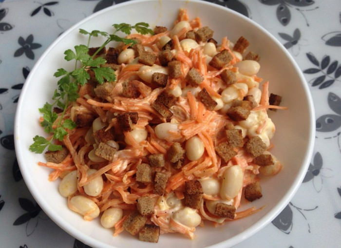 Салат из куриной грудки и корейской моркови с сухариками