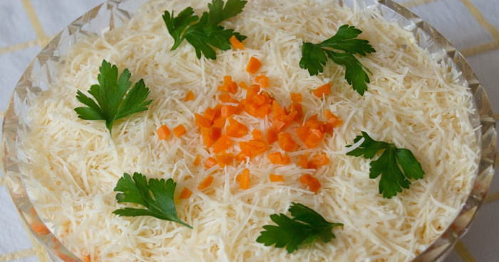 - Завершающий слой – сыр, натертый на средней терке. Украшаем зеленью по желанию и охлаждаем. За это время салатик немного пропитается.