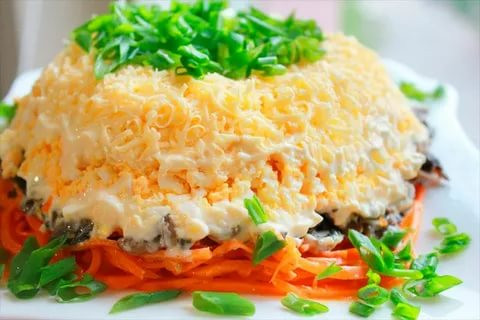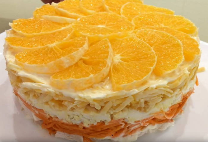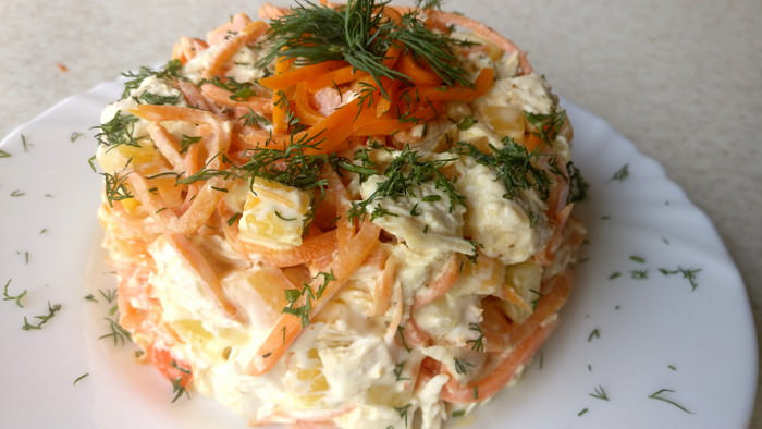 Салат Солнышко с корейской морковью и курицей