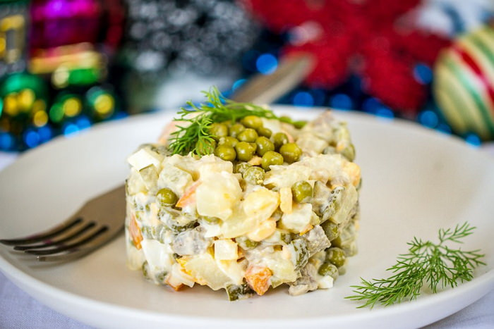 Подавайте салат с зеленью петрушки и укропа, а также со свежим белым хлебом, намазанным сливочным маслом.